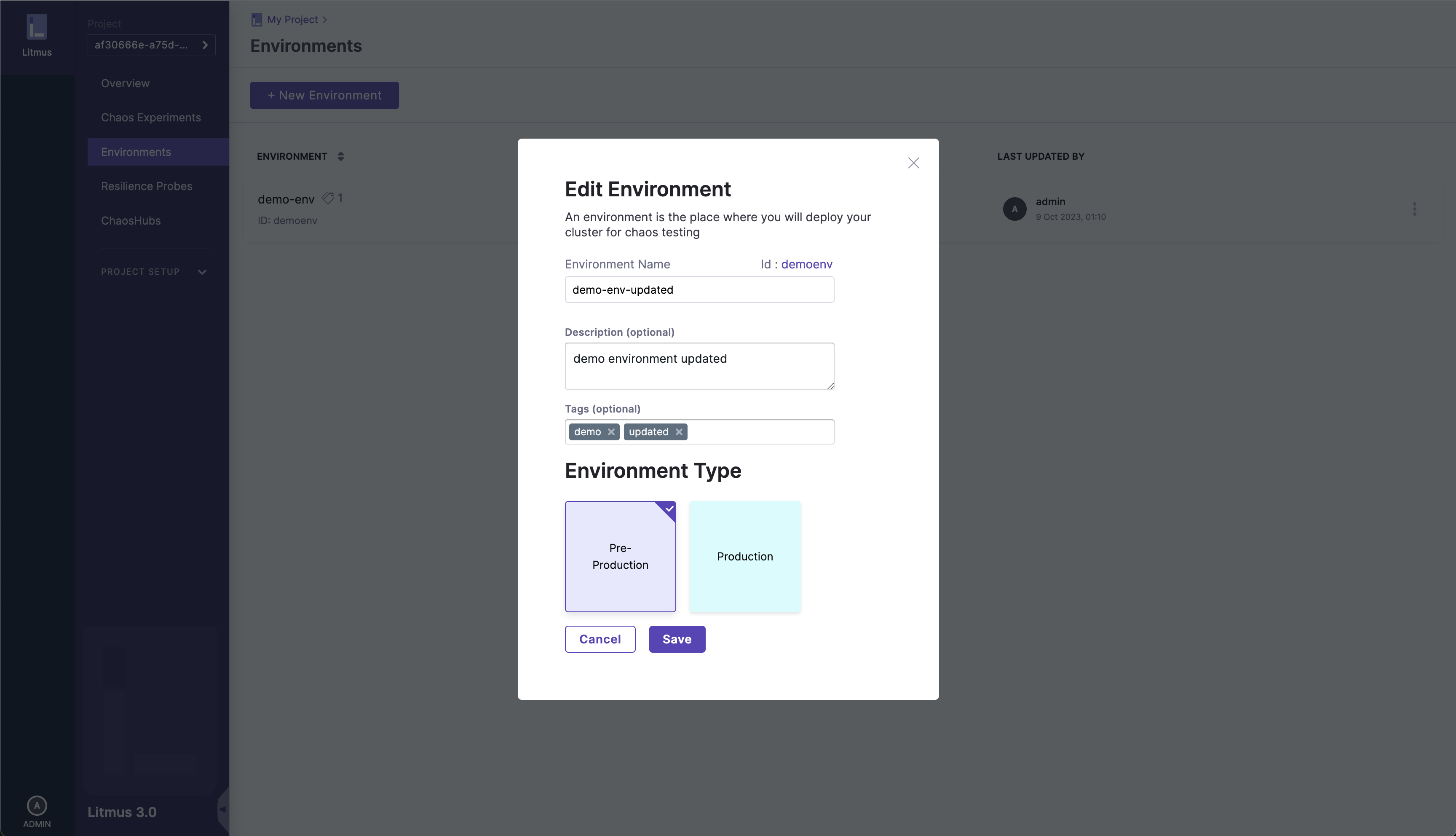 Update the details of the environment as required and click the Save button.
