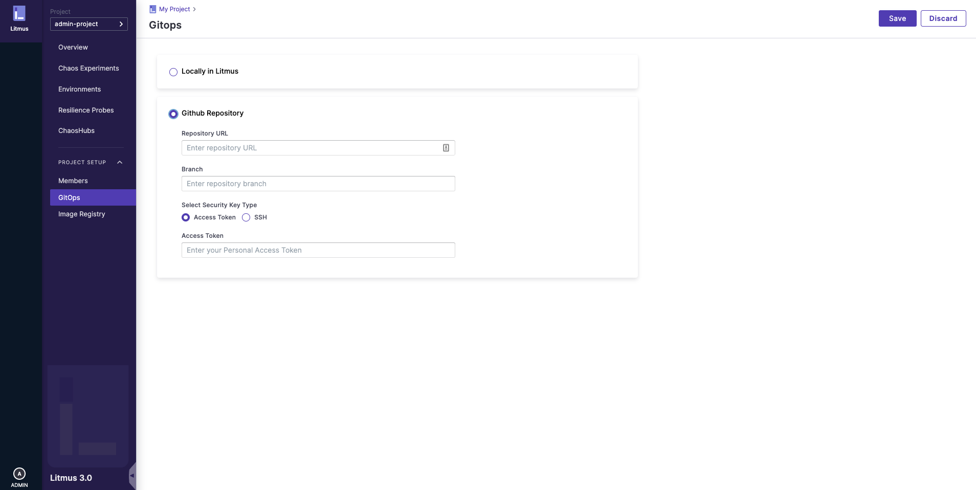 • Login to ChaosCenter and navigate to GitOps (Project Setup > GitOps on the left nav).