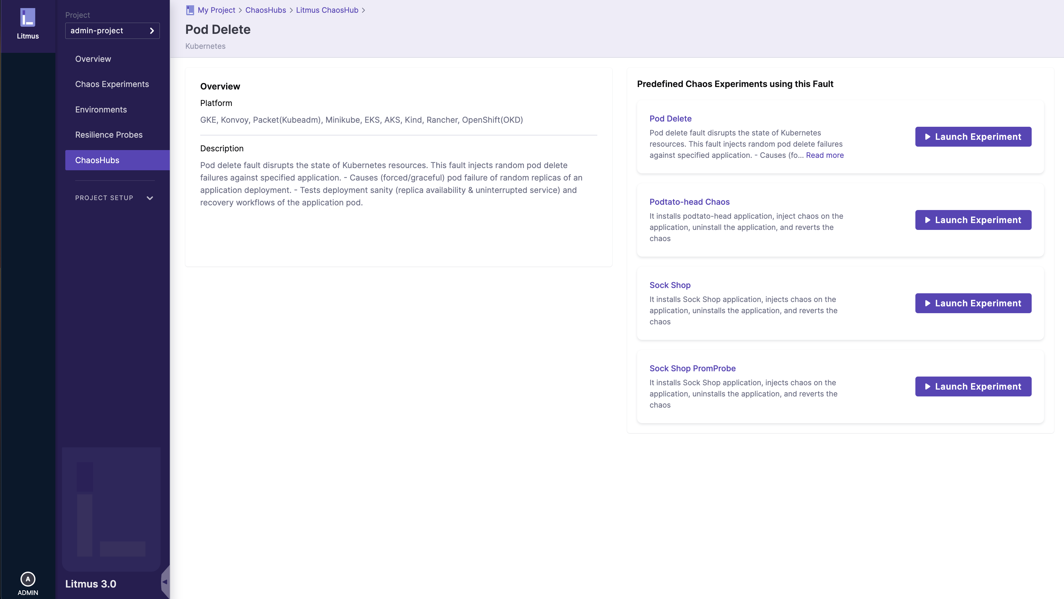 After connecting a ChaosHub, you can view the different pre-defined chaos experiments present in the ChaosHub.